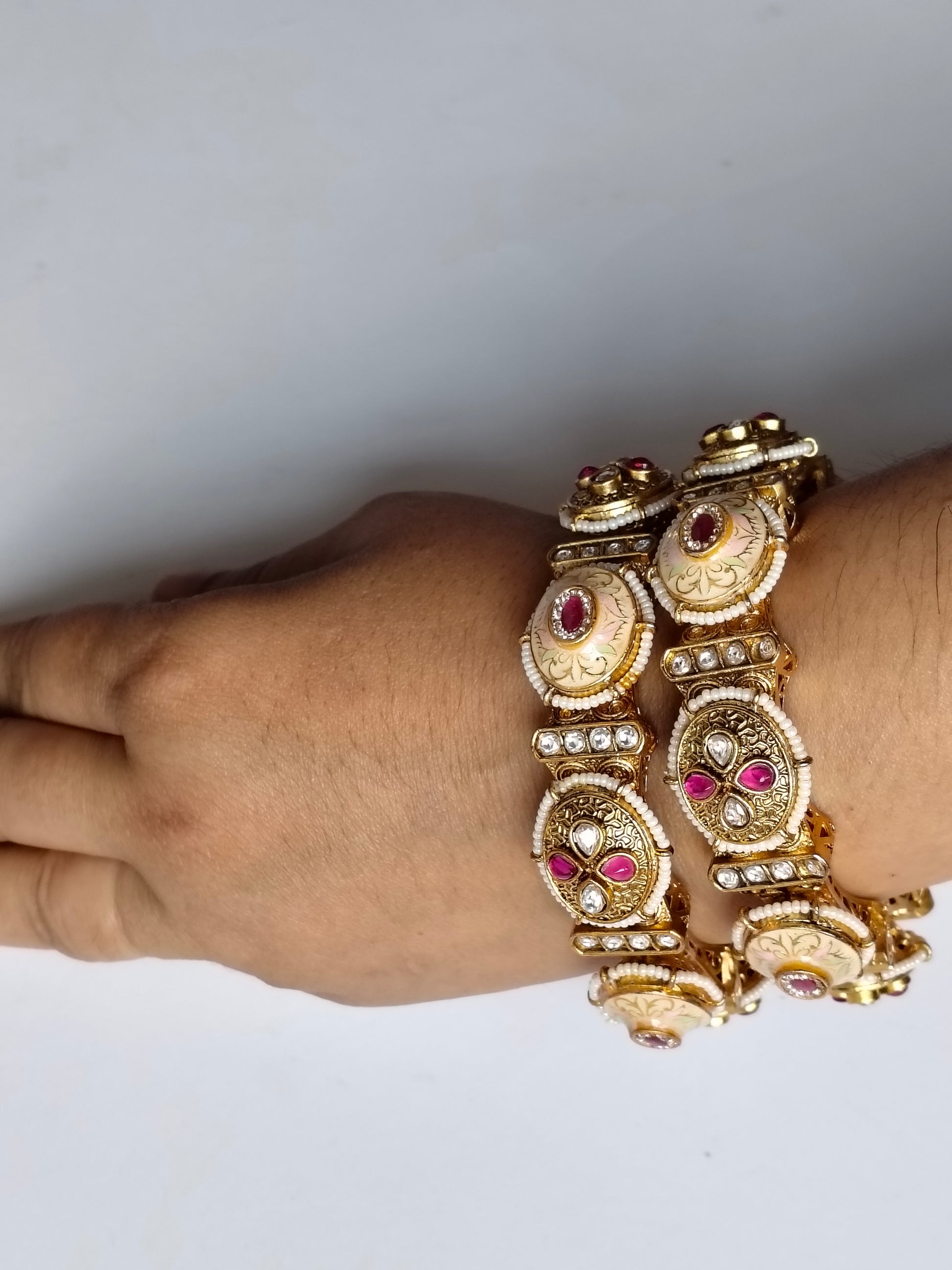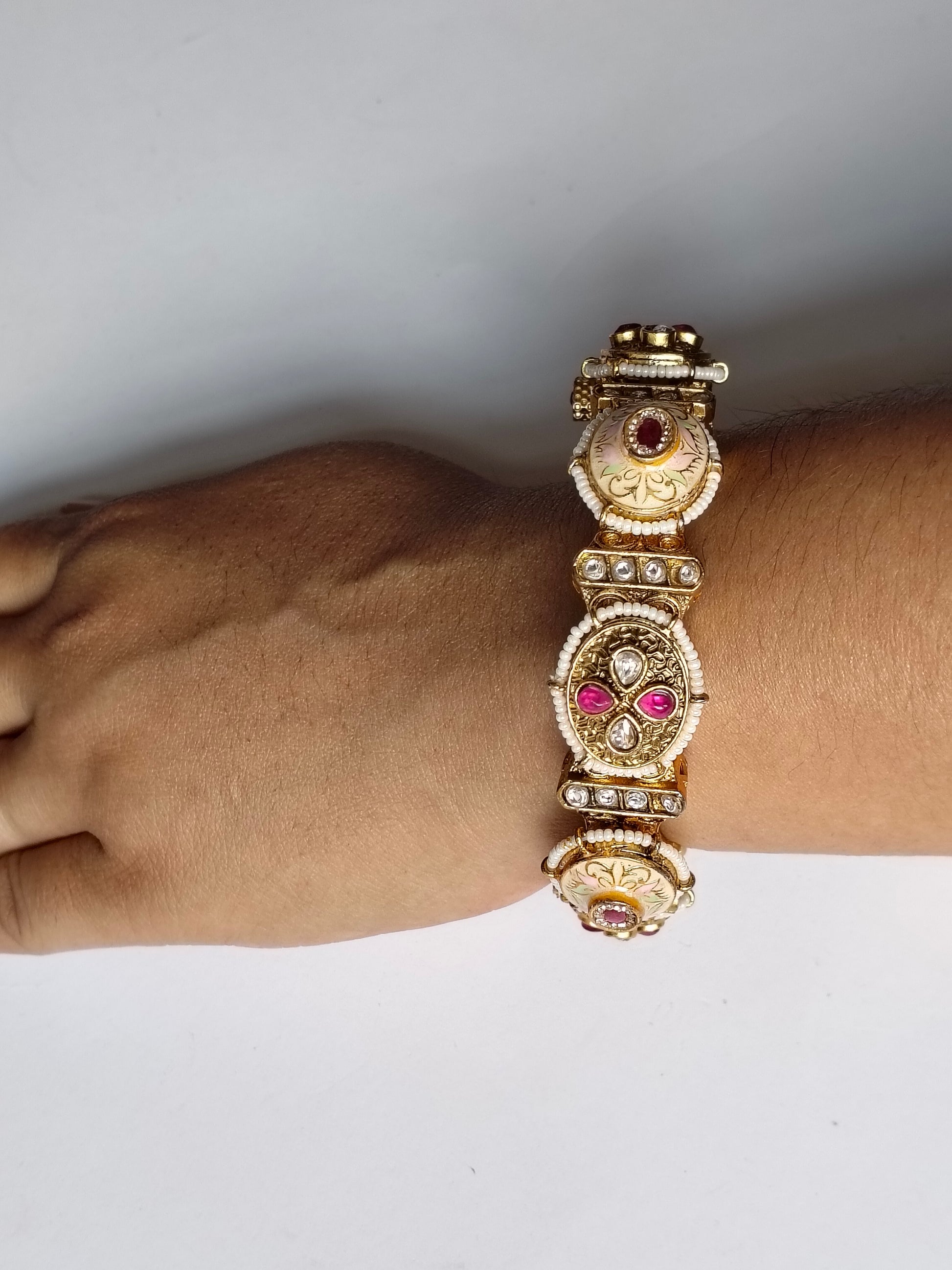 Elevate your ethnic ensemble with this stunning ivory Rajwadi bangle, a timeless piece that seamlessly complements traditional Indian attire. Crafted with intricate detailing characteristic of Rajwadi design, this openable bangle offers both elegance and comfort for everyday wear and special occasions alike.